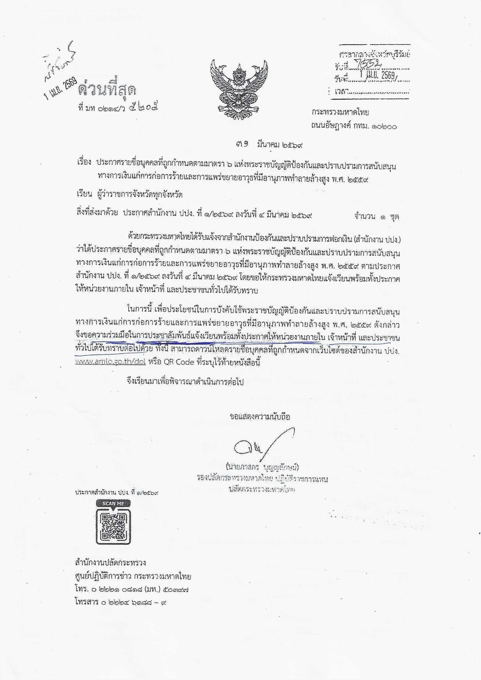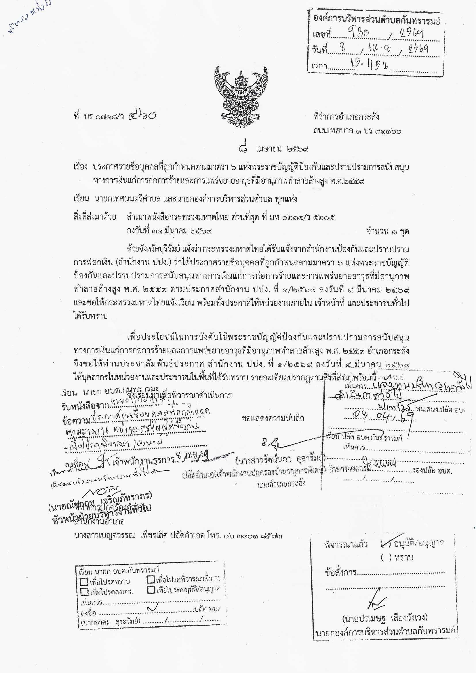 อบต.กันทรารมย์ อ.กระสัง จ.บุรีรัมย์ ขอประชาสัมพันธ์ประกาศสำนักงาน ปปง. ที่ 1/2569 ลงวันที่ 4 มีนาคม 2569 ให้บุคลากรในหน่วยงานและประชาชนได้รับทราบ รายละเอียดตามเอกสารแนบ
